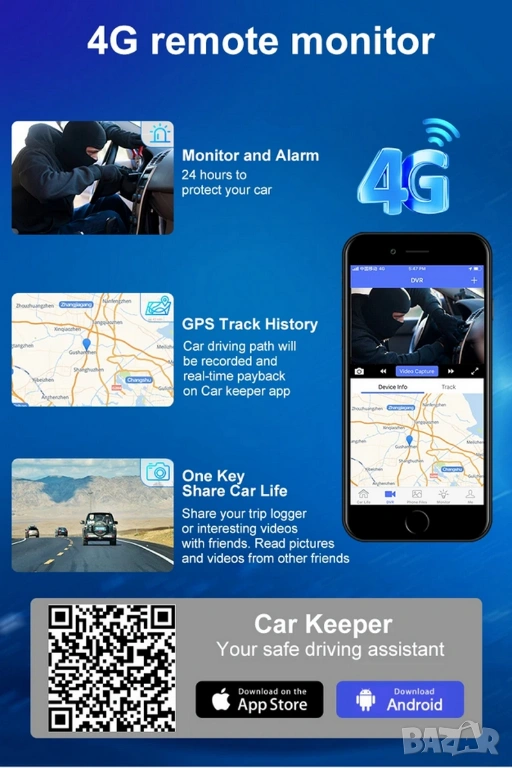 4. Видеорегистратор с ADAS и двоен запис от предна камера 1080P + задна камера 1080P. Синхронизиран дисплей с разделен екран с превключвател за преден и заден екран за запис с един бутон. Когато мобилният телефон е свързан към WiFi мрежата на видеорегистратора, снимките от предната и задната камера на рекордера могат да бъдат прегледани в реално време на мобилния телефон с приложението Carkeeper.