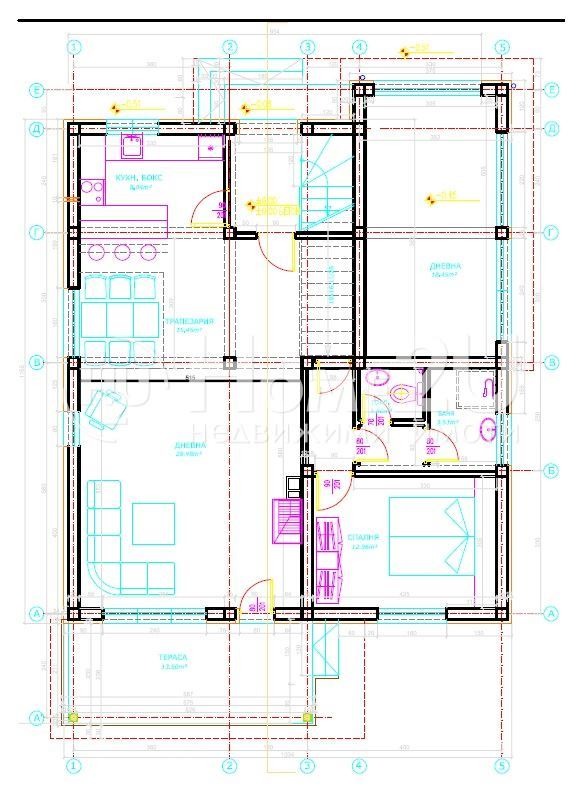 Разпределението на първи етаж - в едно голямо помещение кухня, трапезария и хол, отделна баня, отделна тоалетна и кабинет (спалня за гости).