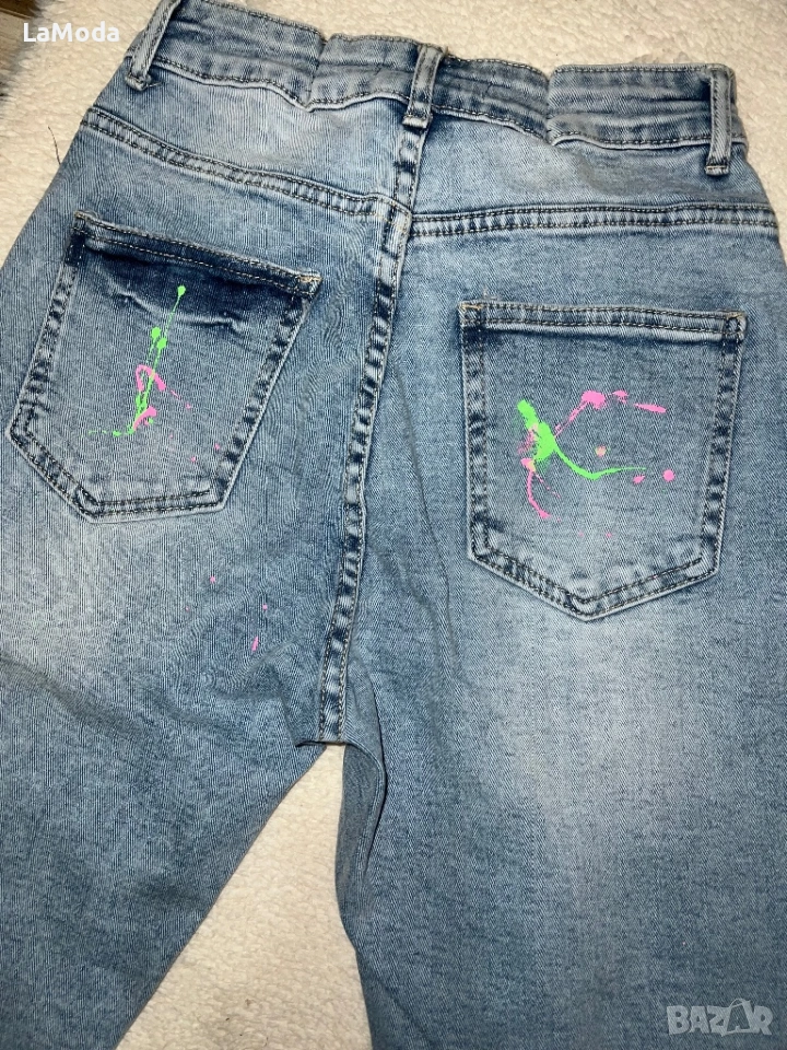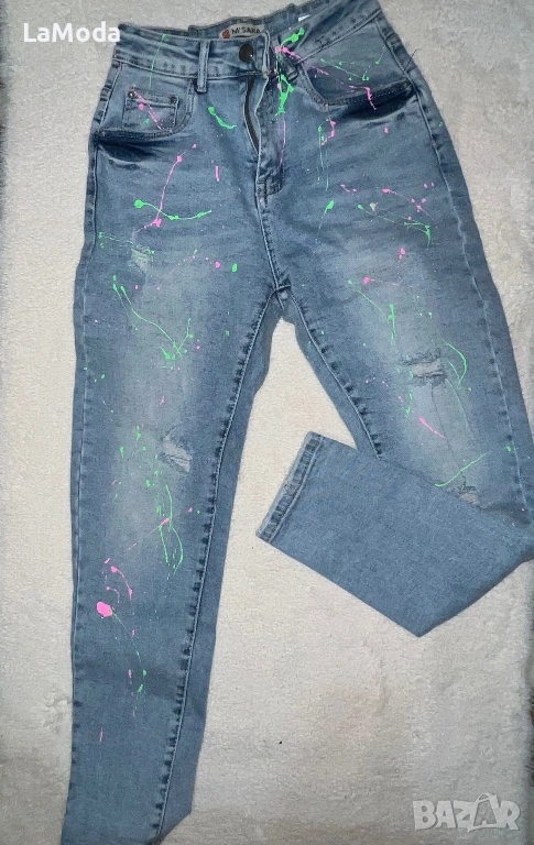 Уникални дамски дънки с леко накъсан ефект, нацапан ефект, висока талия, еластични. Нямат забележки, неизползвани.