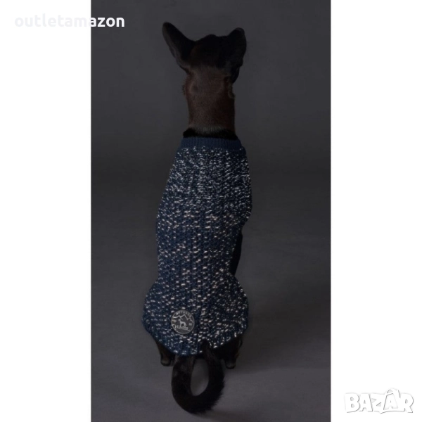 Стилен пуловер за кучета в тъмносин цвят с изчистен дизайн и перфектна кройка. Изработен от акрил със светлоотразителна прежда за допълнителна видимост. Може да се пере на 30°C , размер 55 см, измерени от врата до основата на опашката.