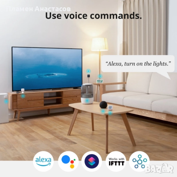 Гласов Контрол: Активира гласовото управление за всички свързани устройства и ИЧ уреди. Работи с популярни асистенти като Amazon Alexa, Google Assistant и Siri.