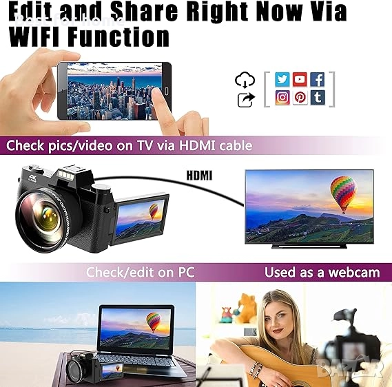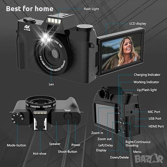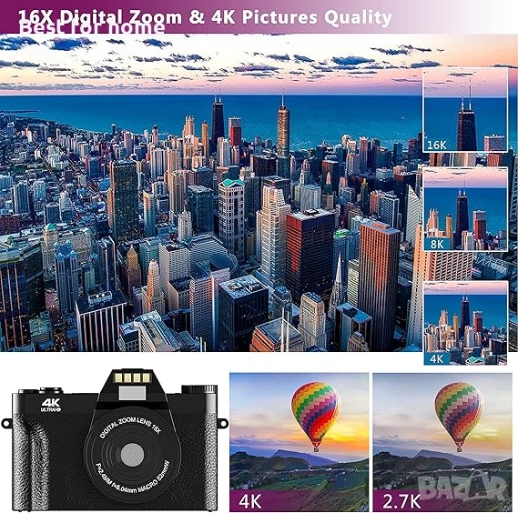 【ВЛОГ КАМЕРА С ОБЪРКАЩ СЕ ЕКРАН】Нашата цифрова камера предоставя видео с висока 4K резолюция при 30 FPS и ясно изображение с 48MP, без да пропуска никакви детайли. 4k камерата поддържа и 16X цифрово увеличение (автоматичното фокусиране не се поддържа). Накланящият се екран е идеален за видео блогове и автопортрети. Ще ви хареса извитата гумирана ръкохватка отпред, около която можете удобно да обгърнете пръста си, без да се притеснявате, че ще изпуснете