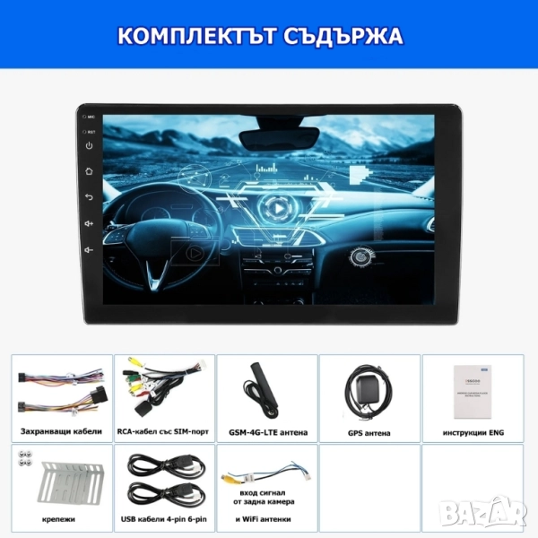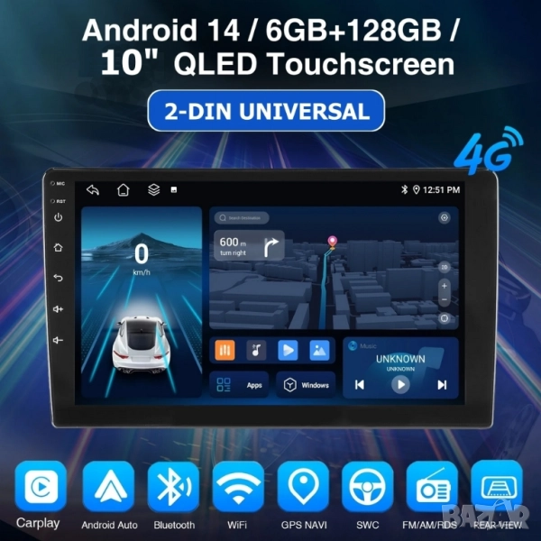 10” 2-DIN мултимедия с Android 14, 4G/LTE, RDS, 6/128GB, CarPlay и AndroidAuto