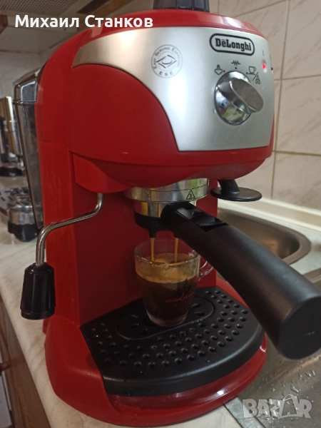 Кафе машина Делонги с ръкохватка крема диск работи перфектно и прави супер кафе с каймак две цетки за единично и двойно кафе