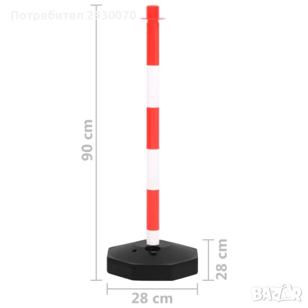 Допълнително може да се закупи пластмасова верига, която лесно да се закрепи към стойките, за да създадете зона с ограничен достъп. Колчетата са леки и много лесно преносими. За допълнителна стабилност можете да напълните с вода или пясък основите към стойките. Ярките червени и бели цветове правят трафик колчетата много лесно забележими.