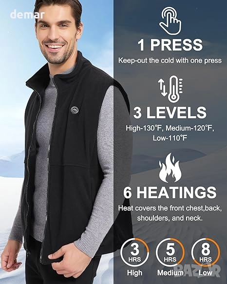 Този отопляем елек разполага с шест уголемени зони за отопление от въглеродни влакна по раменете, гърба, врата и корема за по-бързо и по-равномерно затопляне, захранван от лека батерия от 10 000 mAh, която издържа до осем часа. Той предлага три настройки за топлина, контролирани с едно докосване, и е изработен от мек, дишащ полар за удобно обличане на пластове. Подходящ за пътуване до работа, дейности на открито и ежедневна употреба в студено време, той е и практичен зимен подарък.