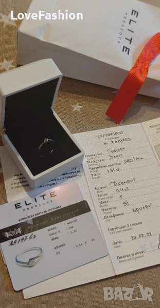 Елегантен златен пръстен с истински диамант — перфектният подарък! ✨ Предлагам изящен пръстен от 585 злато (14K) с фин, искрящ диамант 0.11 ct, цвят F и чистота SI – шлифован в класически брилянт, който улавя светлината невероятно красиво. Пръстенът идва с оригинален сертификат за автентичност от Elite Jewellery. Гаранцията е изтекла, но бижуто е в отлично състояние. Размер - 53-54 /17мм.