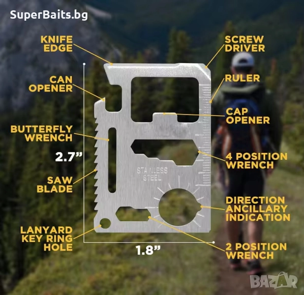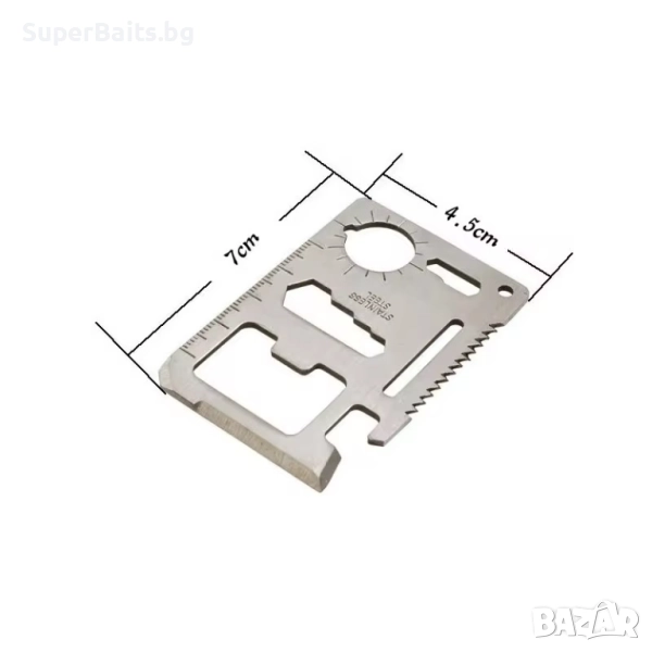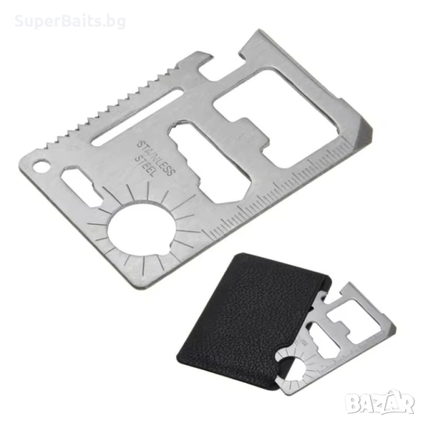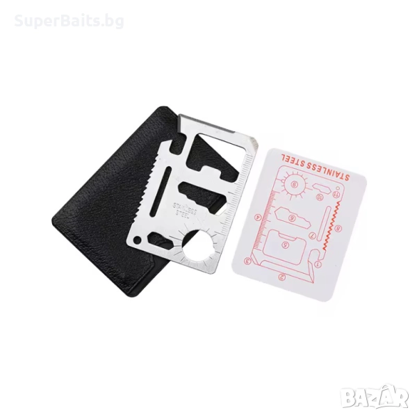 Многофункционален инструмент - карта за оцеляване с 11 функции. Изработена от закалена стомана, компактна и лека, идеално се побира в нормален портфейл.