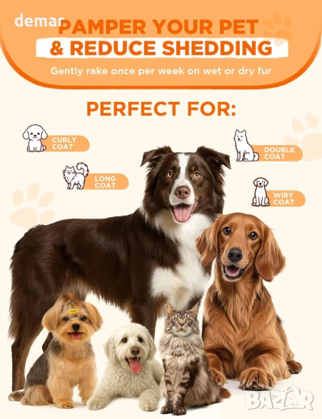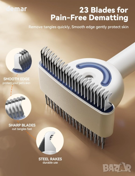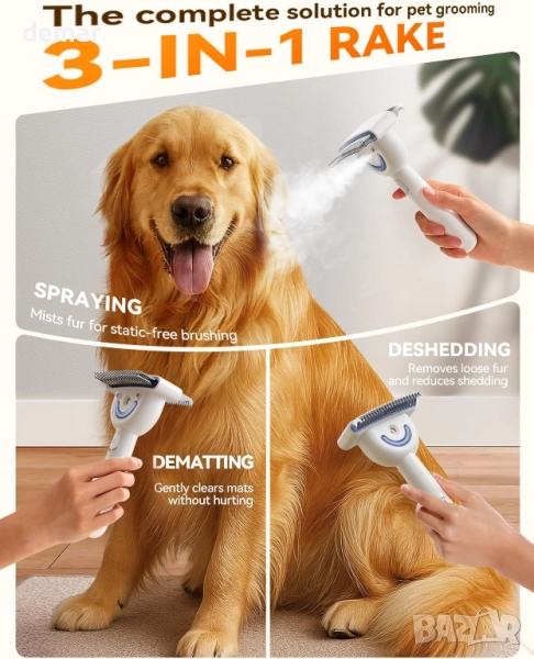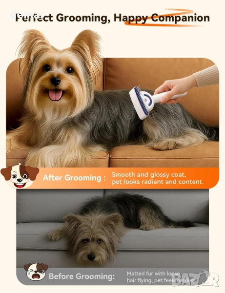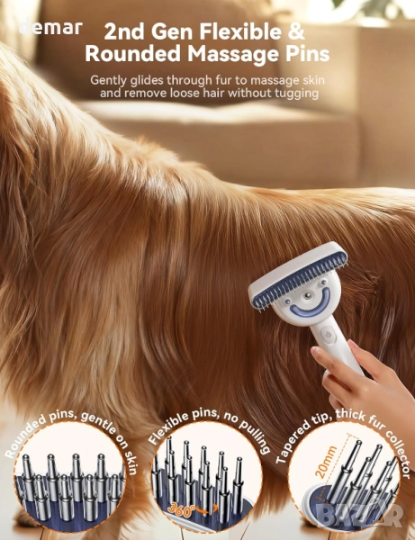 груминг комбинира гребен за подкосъм, гребен за разресване, нож за премахване на косъм, масажна четка и функция за пара, предлагайки ефективна грижа за домашни любимци с дълга или гъста козина. Двустранният му дизайн използва широки метални зъби за справяне с замърсявания и сплъстени влакна, докато заоблените щифтове се справят с ежедневното четкане и грижата за подкосъм с нежен масаж. И двете страни разполагат с регулируеми нива на пръскане, за да омекотят заплитанията, да намалят статичното електричество и да поддържат козината гладка, което улеснява груминг козината за домашни любимци, които не обичат да се къпят. Водоустойчивата конструкция IPX6 позволява лесно изплакване, а устойчивите на ръжда зъби повишават издръжливостта. Видим индикатор за батерията и резервоар за чиста вода добавят удобство, а леката дръжка е идеална за бърз груминг у дома или след дейности на открито.