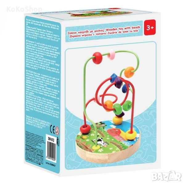 Образователна играчка с дървена основа с дизайн на ферма и два метални лабиринта с цветни пластмасови топчета. Целта на играта е да се преместят топчетата по металните лабиринти, като се следват кривите им и се достигне от единия до другия край.