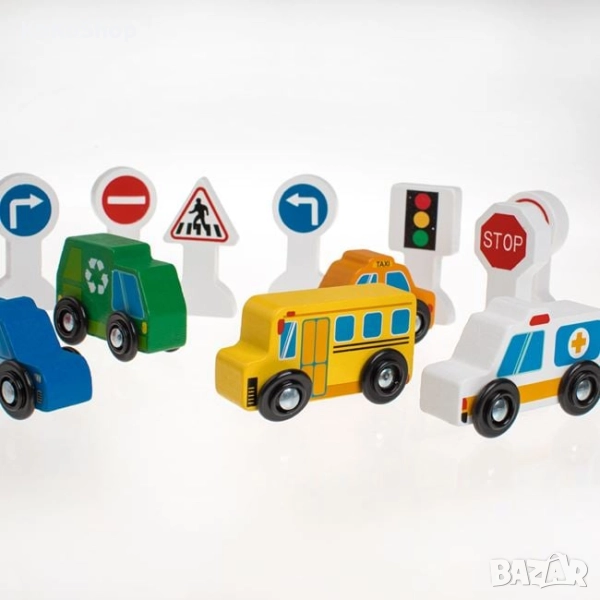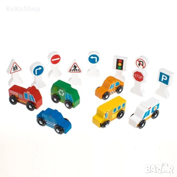 Комплект дървени превозни средства, светофар и пътни знаци. Изключително полезен,защото помага за развиване на детското въображение и запознаване с правилата на движението по пътищата. Комплектът съдържа 15 части-шест дървени превозни средства с колела ( такси, училищен автобус, полицейска кола, линейка, пожарна и камион за рециклиране), осем пътни знака и един светофар.
