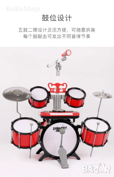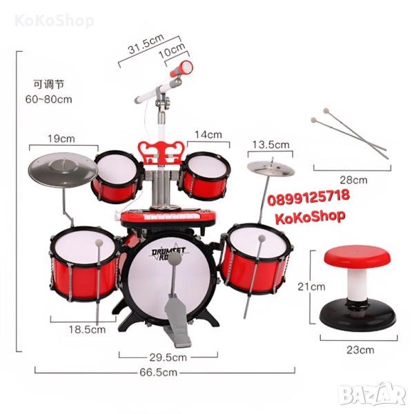 Комплект барабани със стойка за ноти и 2 палки, DJ клавиатура, микрофон и столче за сядане. Елементите са изработени от пластмаса и разполагат със светлинни и звукови ефекти, които се активират посредством натискане на бутони. Измежду звуковите ефекти ще откриете 8 демо мелодии, 2 звука, 8 ритъма и много други. Можете да свържете смартфона си или друго устройство, от което да се пуска музика, което ще гарантира максимално музикално изживяване. Деца и родители, настанете се удобно, защото ви предстои да станете свидетели на най-грандиозното музикално и светлинно шоу, изпълнявано някога в света!