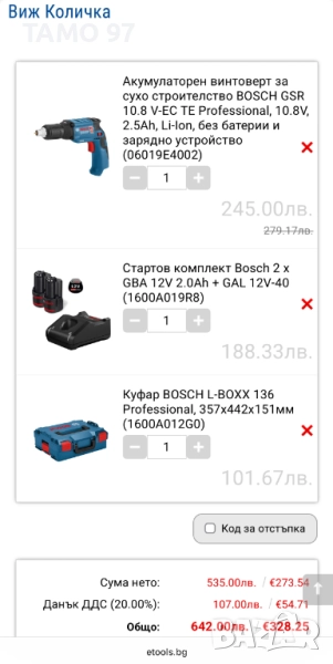 Продавам лек и компактен безчетков винтоверт на Бош за сухо строителство в отлично визуално, състояние както се вижда на снимките и работи перфектно. Оригинално малайзийско производство, внос от Франция. Обявената цена включва машината, 2 батерии по 12V 2.0Ah, зарядно устройство и оригинален L-boxx куфар. Пращаме с опция преглед и тест с куриерска фирма еконт, може и лично предаване за гр. Шумен. Магазинската цена е: 642лв.