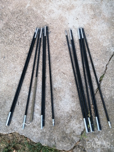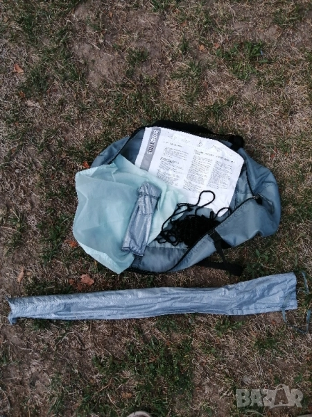 Палатката е използвана 3пъти.Самата палатка е здрава, но едната рейка е счупена и с разтегнати ластици