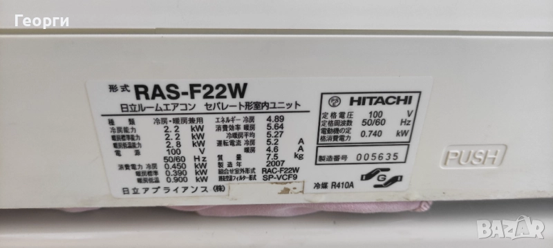 Продавам японски инверторен климатик Hitachi 9000 BTU. Климатикът е напълно обслужен, профилактиран, зареден с фреон и е в отлично техническо състояние. Работи перфектно, изстудядява и топли без никакъв проблем. Особено подходящ е за отопление. Подходящ за малки помещения 10 - 15 кв.м. С оригинално японско дистанционно. Изключително икономичен е и работи без шумно, външното тяло е изключително тихо. !!! Цената на трансформаторът за 100 V не е включена - цената му е 40 евро.
