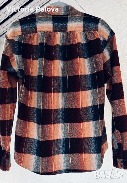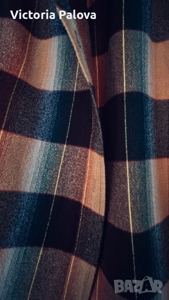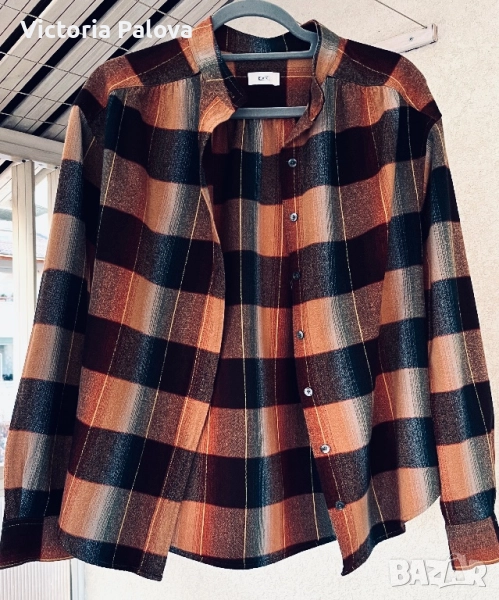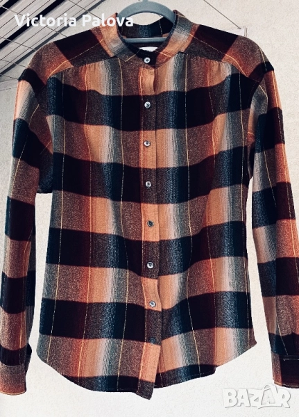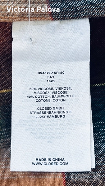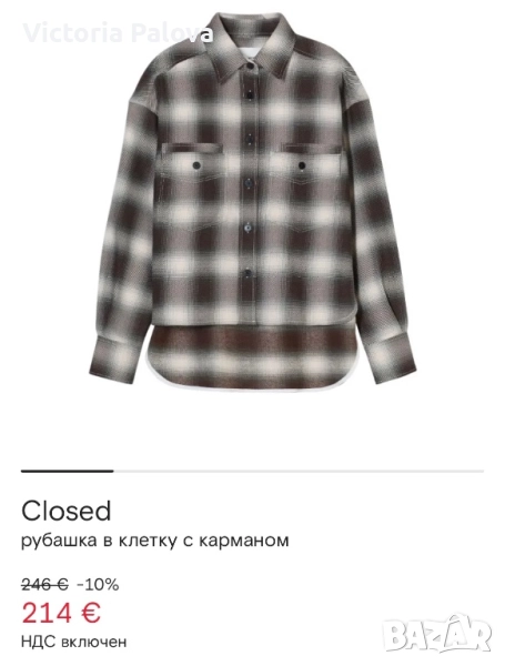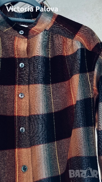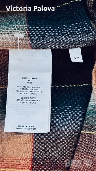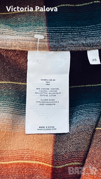 Closed - елегантен casual с немска прецизност. Класическа button-up риза с отворена яка за свободен модерен вид. Смел plaid ( кариран) принт в богати есенни тонове - класически мотив, който добавя усещане за топлина и автентичност. Oversized силуета позволява вариации - да се носи разкопчана като яке или закопчана за структуриран вид. Долният край е леко извит, без излишни детайли - чист минималистичен дизайн. Материята има фланелена текстура, мека и гладка на допир, с прекрасно качество - топла, устойчива на износване и приятна към кожата, сертифицирана GOTS. Високата цена отразява премиум качество на вискозата и памука плюс марковия статус. Рамо - 51см, ГО - 53см, дължина - 67см, ръкав - 57см.