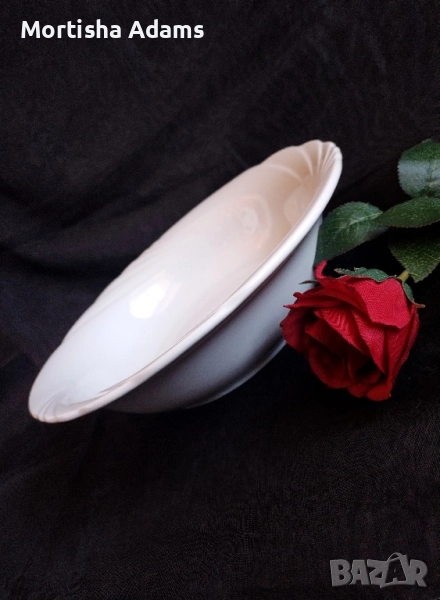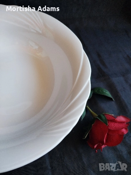 ⚜️ Изчистен, семпъл комплект- бял порцелан, без маркировка. Съдовете са здрави, с леки драскотини по глазурата на чиниите. Смятам, че са следствие от неправилно съхранение една в друга. Дребни производствени несъвършенства.