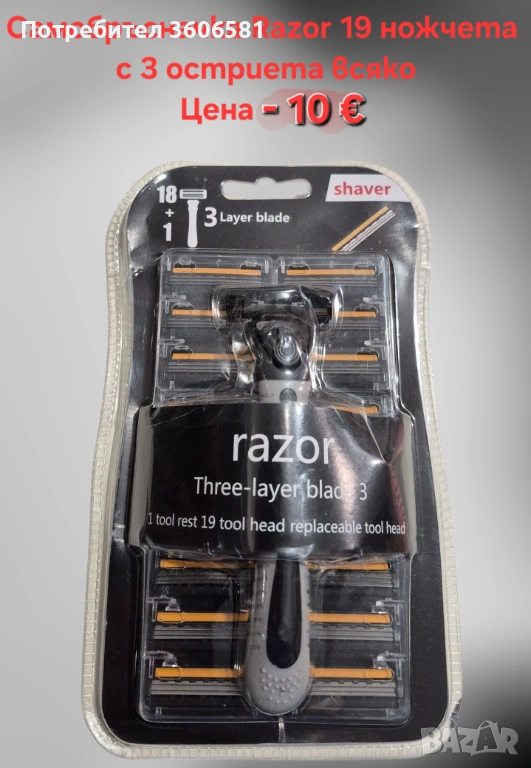 2. Ръчна Самобръсначка razor Three - layer blade 3 , Самобръсначка с 19 ножчета Цена - 10€, 3 ножчета Цена - 1 €, всяко със 3 остриета бръснещо добре , на ниска цена за непрециозни и не много твърди бради, идеален за ежедневна грижа на хигиената на мъжа или жената , с нежна грижа към кожата чрез овлажняващата лента която има детоксикиращо и почистващо действие.