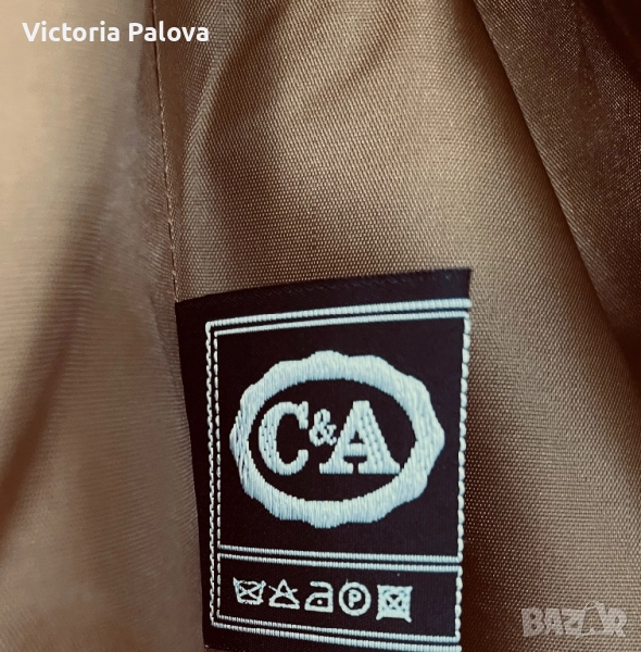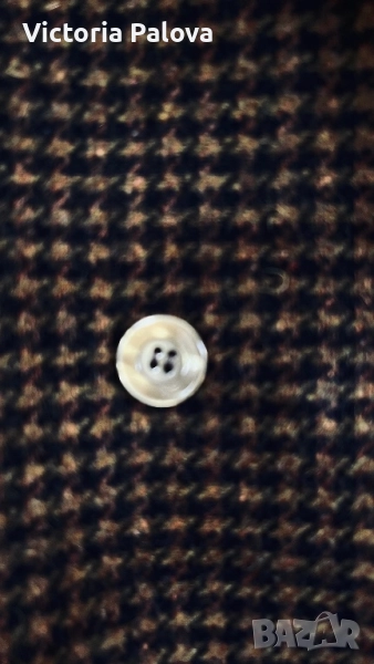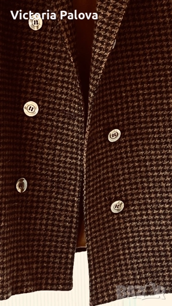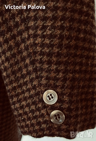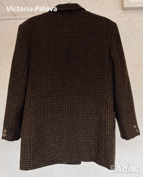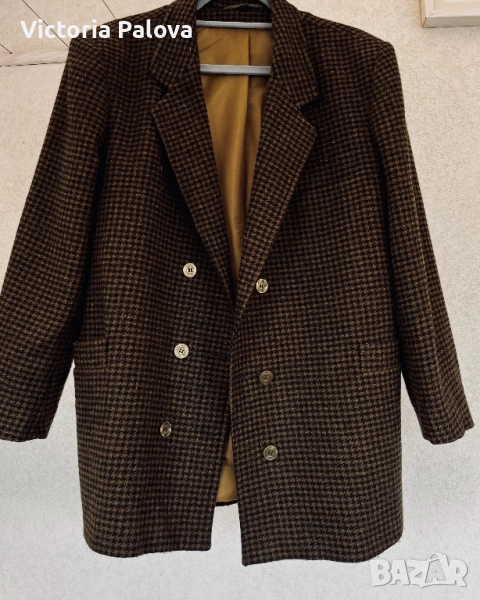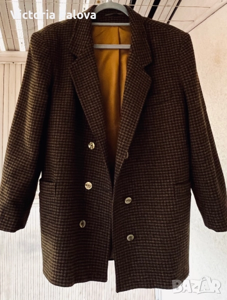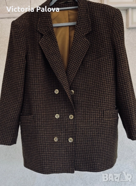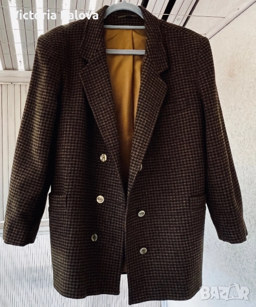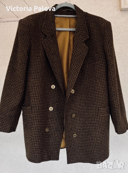 Размер 40, идеален за фигура М и малък L, рамо - 48см, ГО - 56см, талия - 53см, дължина - 76см, ръкав - 57см. Този красив блейзър от 80-те е истинско съкровище за колекционери. Висококачествена вълна 75% и 25% полиестер за издръжливост, с класически houndstooth принт в топли кафяви тонове. Подплатата е в златист оттенък - максимален комфорт през есента и зимата. Перфектен за smart casual стил - с дънки или костюмни панталони - ретро шик, който никога не излиза от мода!