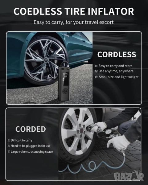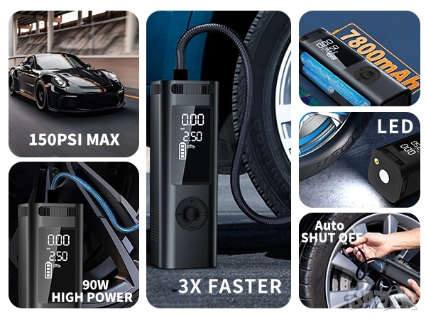 Преносим Компресор за Гуми, Цифрова Интелигентна Помпа с Бързо Зареждане
