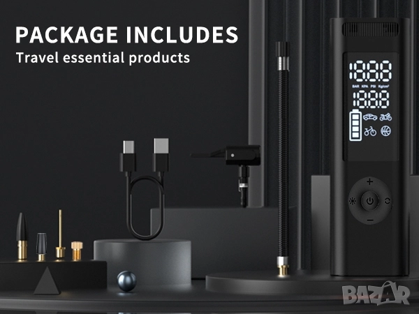 Комплектът включва преносимия компресор и 4 типа аксесоари за напомпване, които покриват широк спектър от нужди: