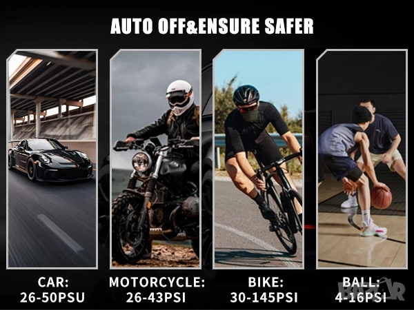 | Автоматично Изключване | Да (Auto Shut-Off) | Предотвратява пренапомпване, удължавайки живота на гумите и на компресора. |