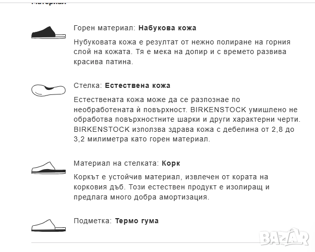 Естествената кожа може да се разпознае по необработената ѝ повърхност. BIRKENSTOCK умишлено не обработва повърхностните шарки и други характерни черти. BIRKENSTOCK използва здрава кожа с дебелина от 2,8 до 3,2 милиметра като горен материал.