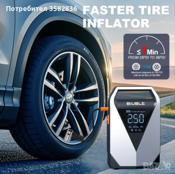 Позволява ви лесно да надувате автомобилни гуми, велосипедни гуми, топки и други надуваеми предмети.