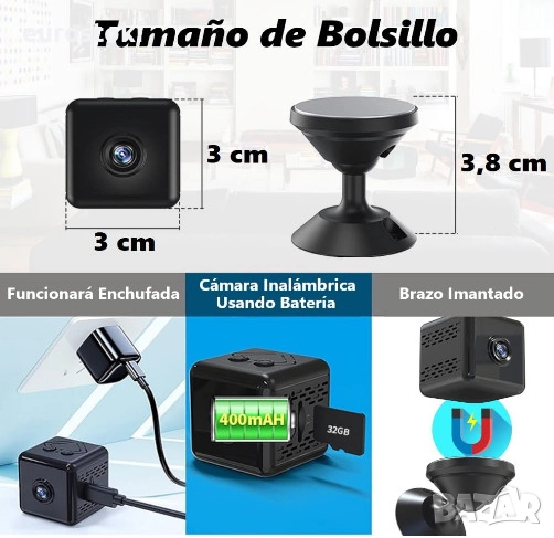 Малък и компактен размер 3 x 3 x 3 см. Ултра компактният размер прави тази безжична камера за наблюдение трудна за откриване. Тя може да бъде скрита във вашия имот благодарение на скобата, която може да се насочва във всяка посока. Допълнена от 150-градусов ъгъл на видимост, тя се превръща в надеждна мини шпионска камера.
