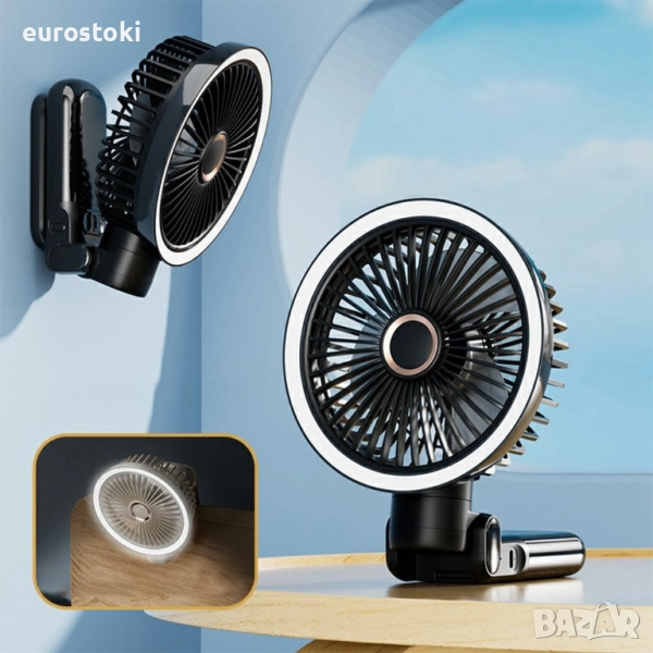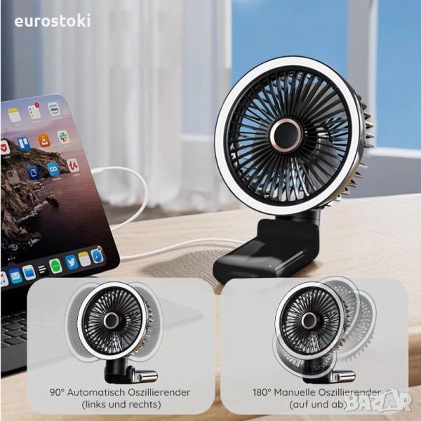 GF12 Многофункционален тих осцилиращ на 180° вентилатор със нощна светлина, с щипка, акумулаторен 3600mAh вентилатор за маса, дом, офис, спалня, 3+1 скорости, черен