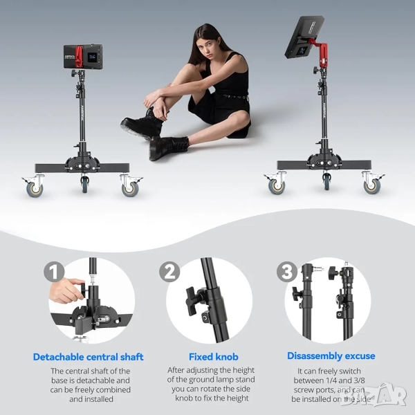 Ключова характеристика е раздвижният централен щанг, който позволява да регулирате височината на оборудването си плавно и лесно. Стойката се състои от три секции, които се заключват със здрави болтове. За по-голяма гъвкавост, долният участък може да бъде демонтиран, за да се монтират колелата, които са включени в комплекта. Това я прави перфектна както за статични снимания в студио, така и за подвижни сцени, където трябва бързо да премествате осветлението.