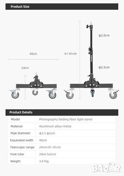 Тази професионална подова стойка от AMBITFUL е изключително стабилна и универсална, предназначена за фотографи и видеографи. Тя е идеалният избор за закрепване на студийни светкавици, LED панели, софтбокси, отражатели и друго фотографско оборудване. Стойката е изработена от висококачествени материали, което я прави много здрава и издръжлива, способна да поддържа тежки устройства безопасно.