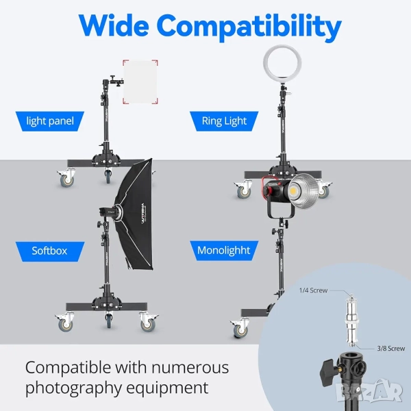 · Универсална съвместимост: Подходяща за повечето марки студийно осветление и аксесоари със стандартен винт 1/4" или 3/8".
