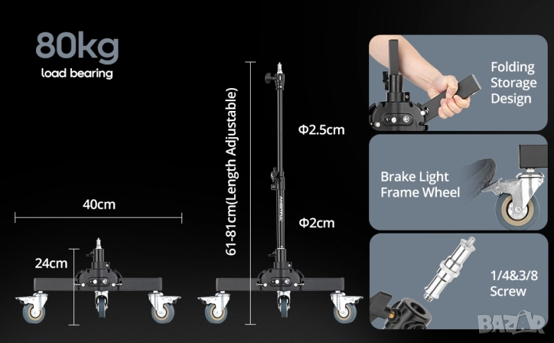 Тази стойка е отлично решение за всеки, който търси надеждно, стабилно и подвижно основание за своето студийно осветление.