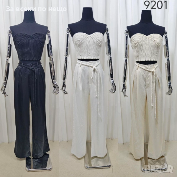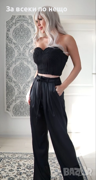 Постигнете ефектна и стилна визия с този модерен комплект, съчетаващ изискан бюстие топ и широки панталони от сатенирана материя. Идеален избор за вечерни събития, парти, коктейл или специални поводи.