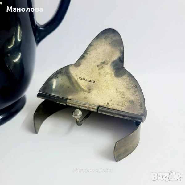 В добър антикварен вид, каната за мляко е с калаен подвижен капак. Калаеният капак има малък лост за палеца, за да отвори част от горната част. Долната страна на капака е щампована TRAFALGAR. Общото състояние е добро, имайки предвид възрастта и. Моля разгледайте снимките! Пукнатина в горната част, която е само от външната страна. Има и леки драскотини по самото тяло на каната.