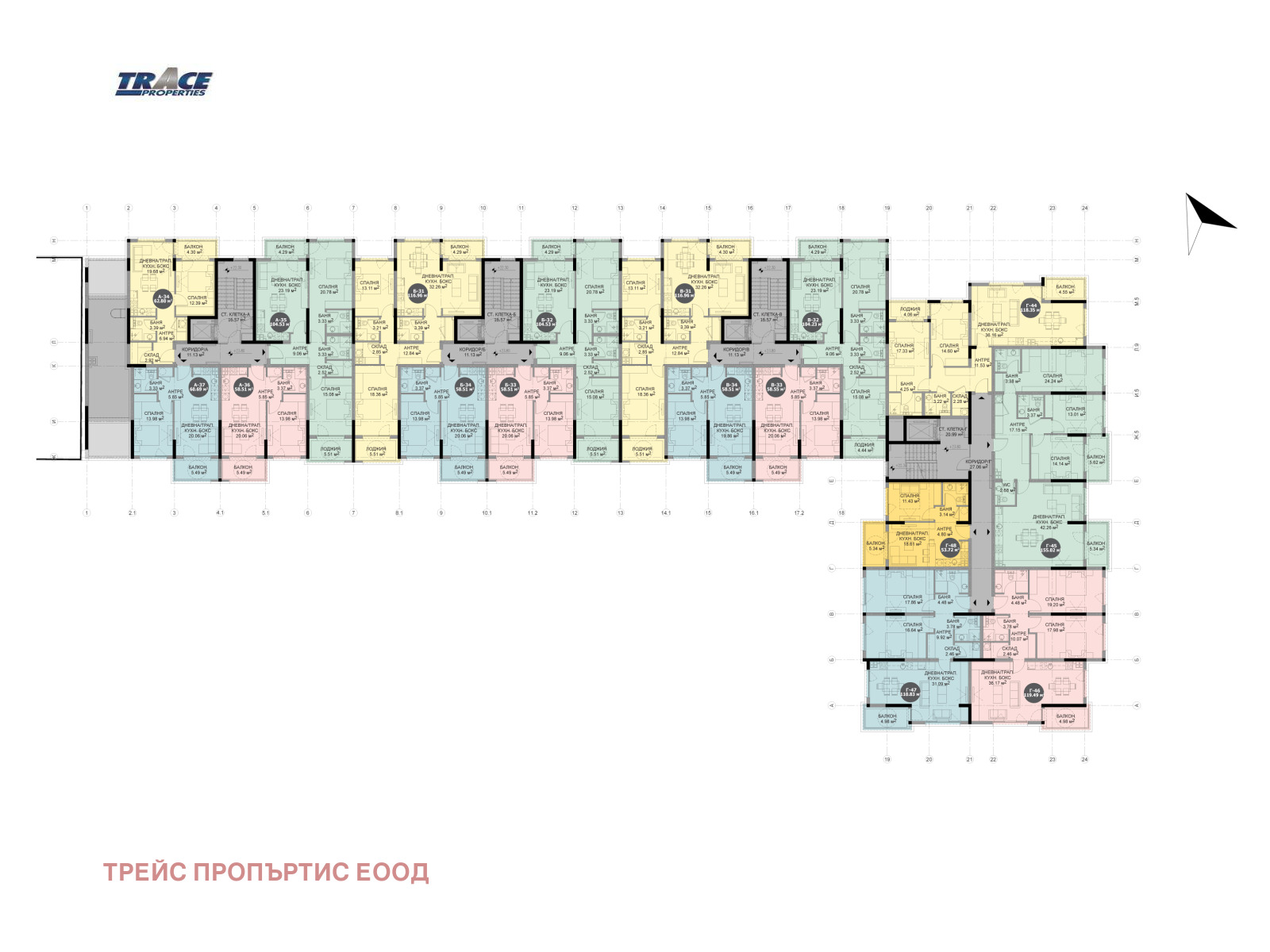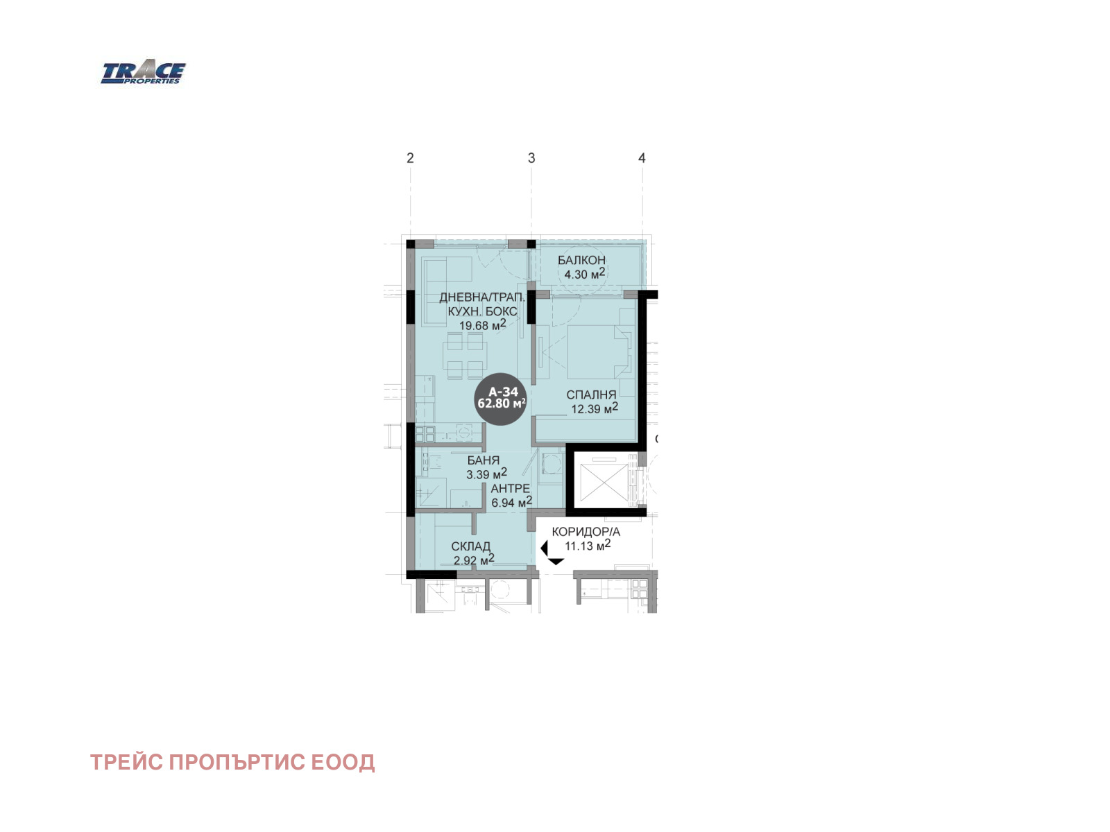 Апартамент А34 се намира на девети етаж, кота +23.80, състоящ се от дневна с кухня, спалня, баня с тоалетна, склад, балкон.