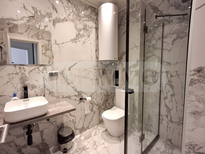 Луксозна баня, изпълнена с висок клас мраморни плочи и стъклена душ кабина