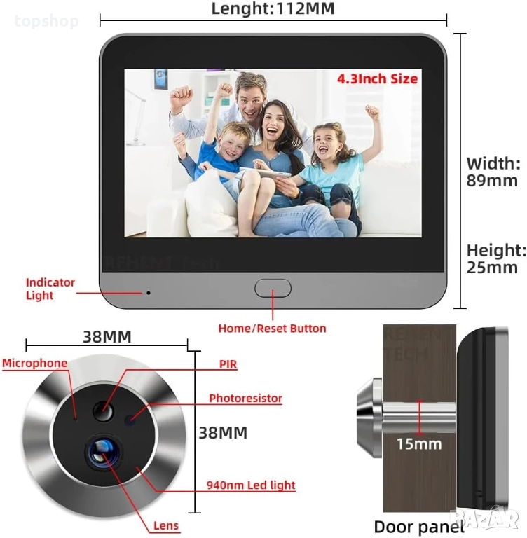 шпионка с вградена батерия 5000mAh и 32GB MicroSD, безжична с 4.3" цветен екран, камера за врата, еднопосочно аудио, PIR детектор на движение