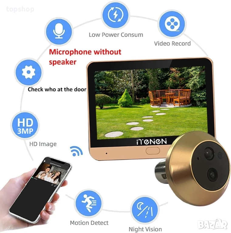 【С 32GB MicroSD】- Включена 32G TF карта за локално записване или запис на събития. Съхранението в облака изисква абонамент! 32GB TF карта за 90 дни запис. Дебелина на вратата: 35-115 мм, диаметър на клюна: 15-36 мм (моля, измерете дебелината на вратата преди покупка). **Поддържа САМО 2.4Ghz Wi-Fi за свързване с приложението. 5Ghz Wi-Fi не се поддържа!
