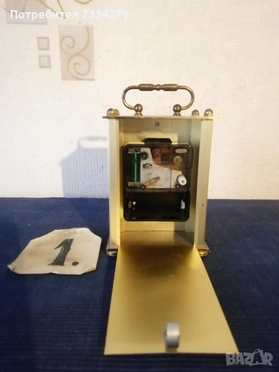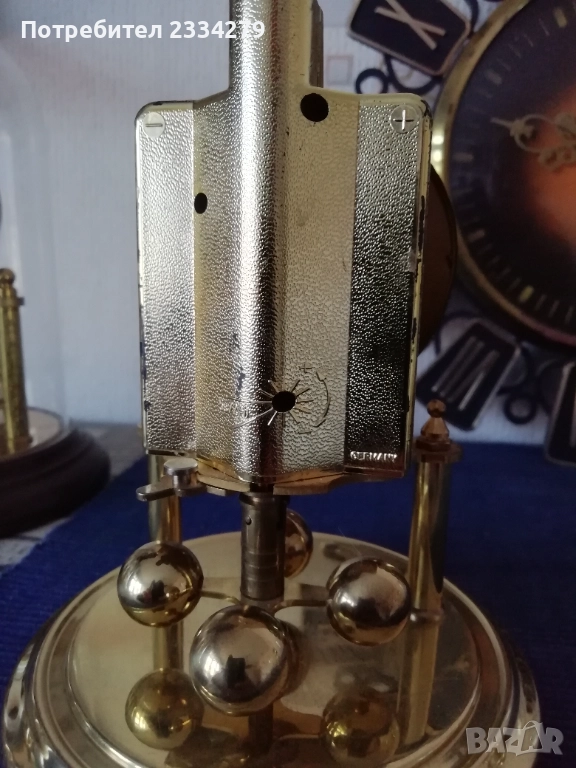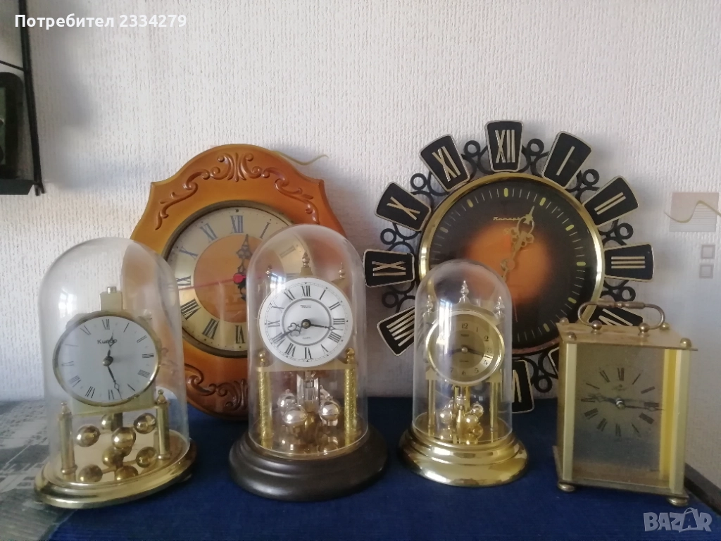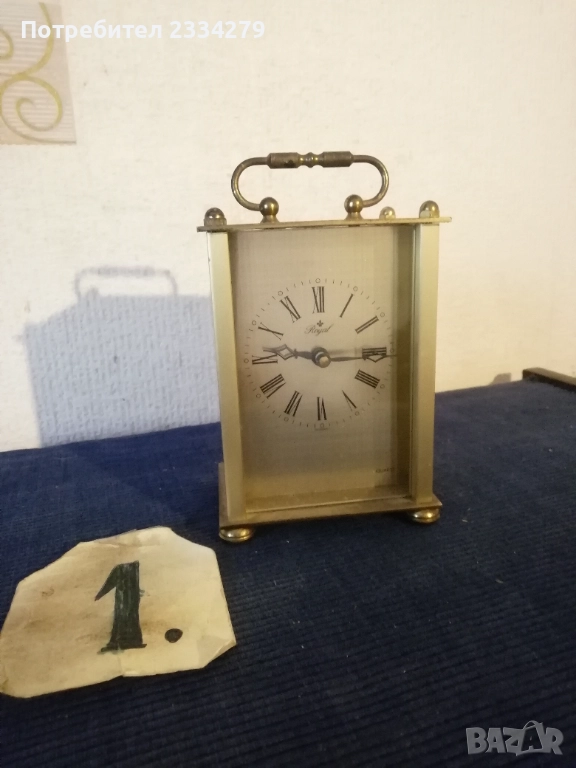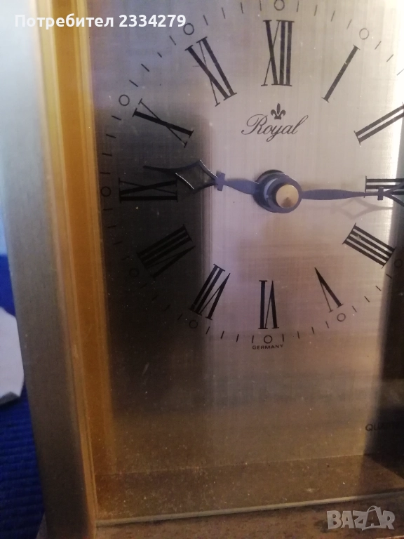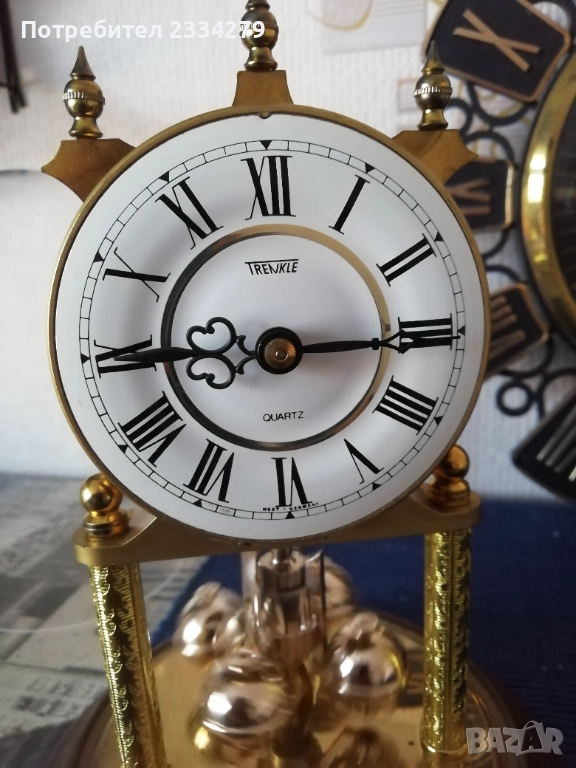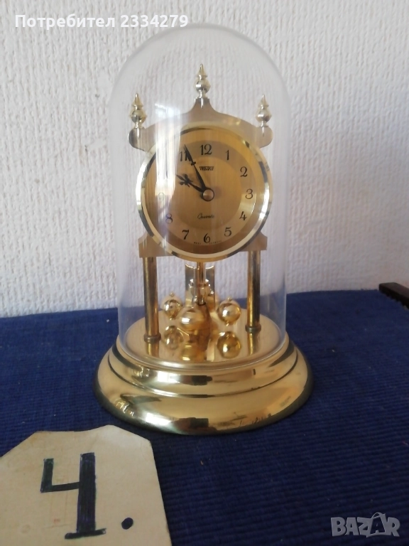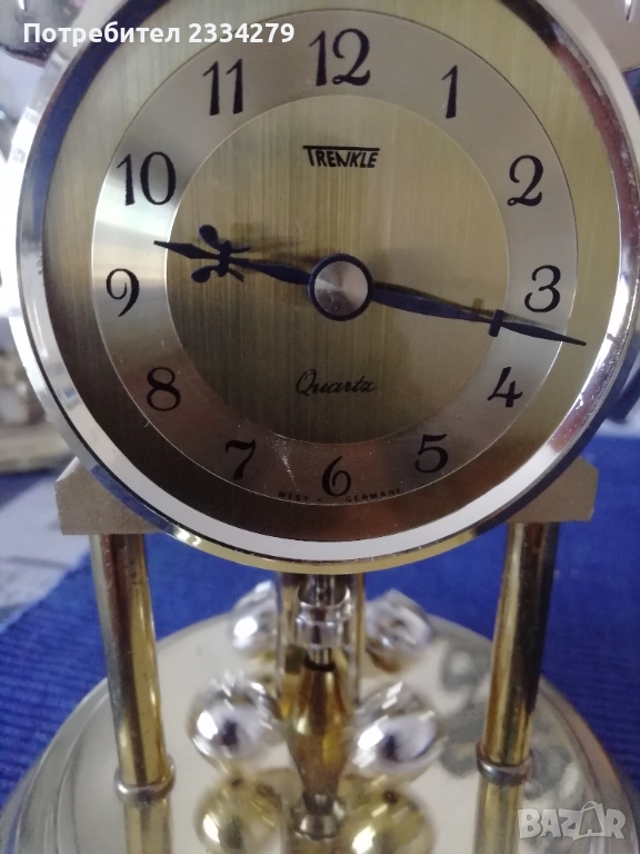 Стари настолни електро механични часовници от 70-те години, изработка във Федерална Република Германия; N:1стар настолен, каминен електромеханичен часовник ,,Royal" QUARZ Dermany, метален бронз, цена 23€. N:2 стар бронзов часовник електро механичен ,,КINDO" Germany, размер 20х13см., масивен с регулиращи крака, цена 23€.; N:3 стар бронзов каминен часовник ,,TRENKLE" QUARZ made in W.Germany въртящи топчета, колба с размери 23х14см., цена 25€; N:4 часовник ,,TRENKLE" QUARZ, West Germany, размери 19х12см., цена 25€; N:5 стар