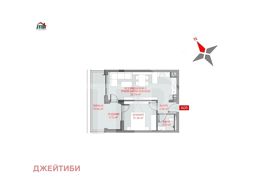 Разпределение: Антре , дневна с кухненски бокс, спалня , баня с тоалетна и тераса.