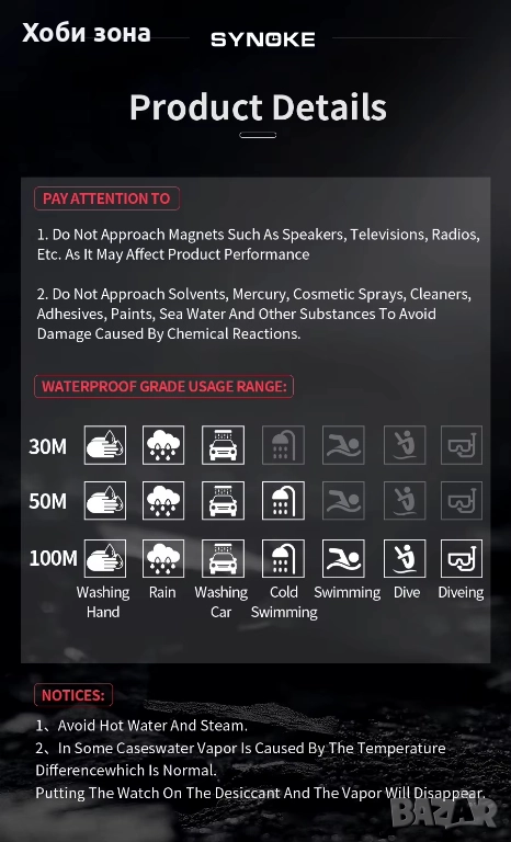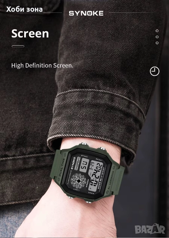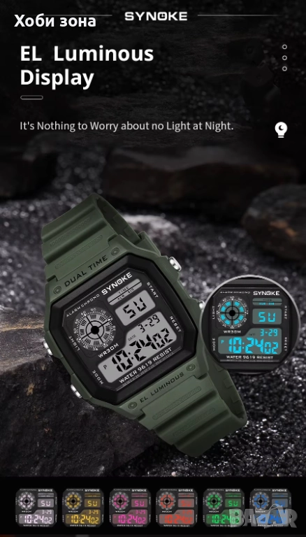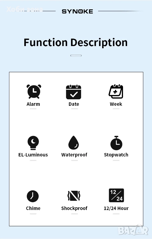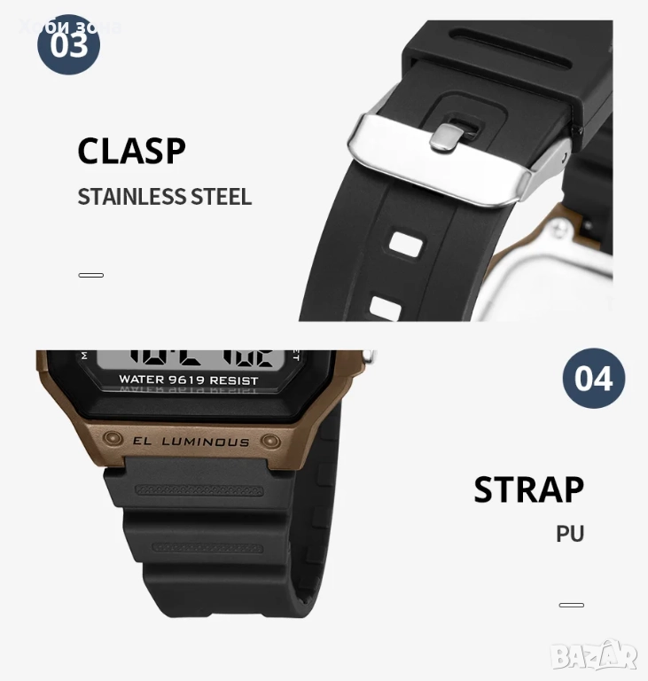 Функции: Водоустойчив 30м, Аларма, 12/24 час, Хронограф, диодна подсветка - 7 цвята, дата, ден, седмица, месец