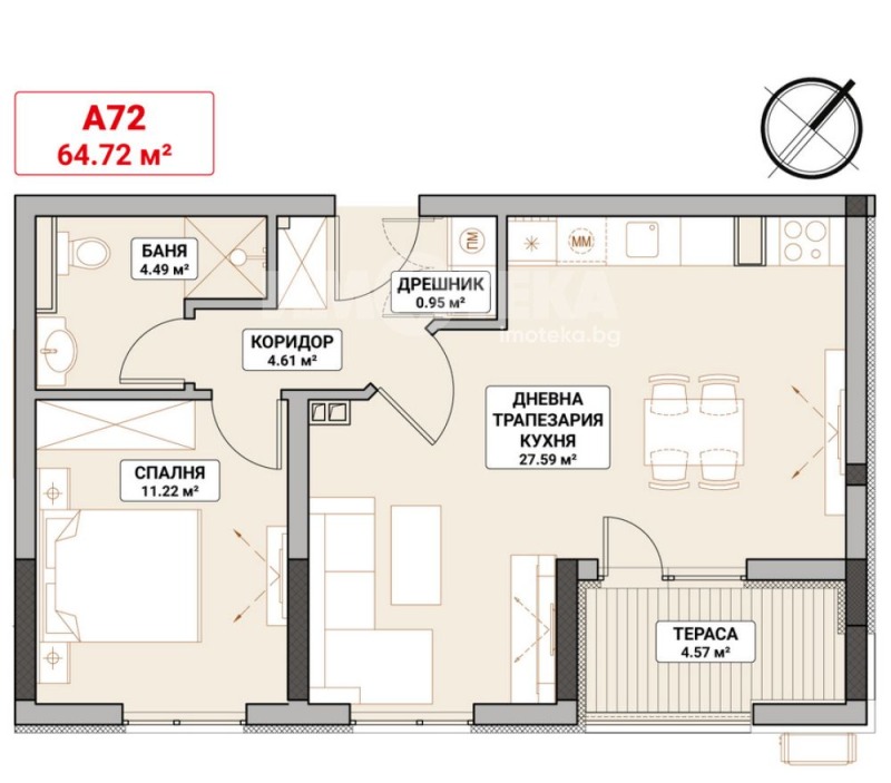Просторен двустаен апартамент със следното разпределение: просторна всекидневна, спалня, баня с тоалетна, коридор и тераса.
