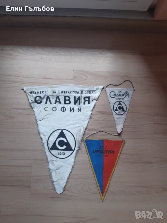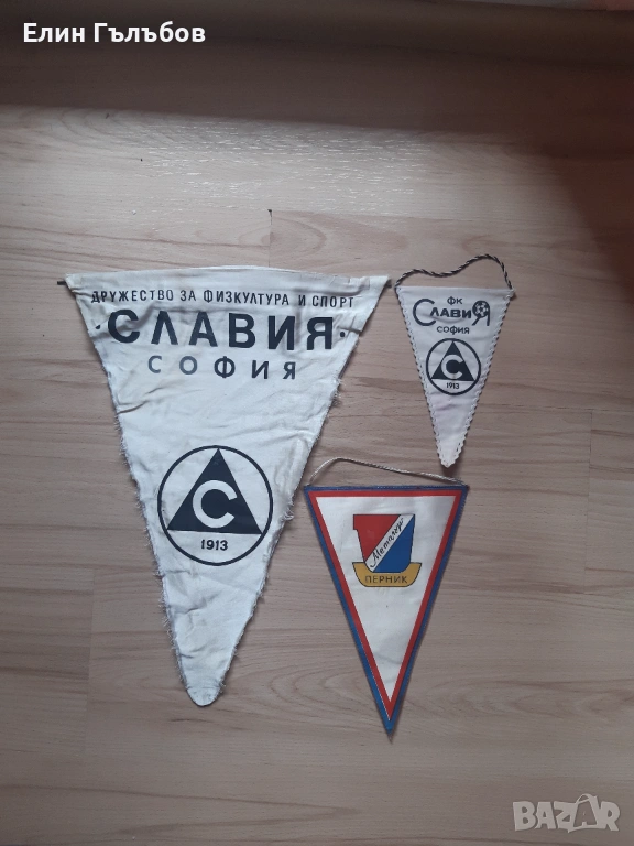 1.Колекционерски флаг на Ф.К. Славия София.Флага е изключително стар.Не мога да кажа с точност,но е над 50 години.Флага на Ф.К. Славия София е от плат.Има следи от употреба.Еднолицев.Флага има възможност за закачане на стена.Доста е голям.