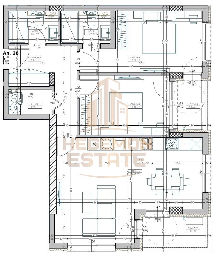 Разпределение: коридор, кухня с хол и трапезария, две спални, две бани с тоалетна, килер и две тераси.