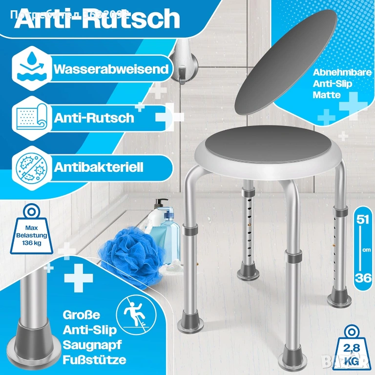Този душ стол впечатлява със своите водоотблъскващи свойства, което го прави идеален за употреба във влажна среда. Антибактериалната повърхност осигурява допълнителна хигиена и предотвратява развитието на микроби и бактерии, като поддържа стола безопасен и чист. Оборудван с подвижна противоплъзгаща се подложка и голяма противоплъзгаща се вендуза за крака, душ столът предлага максимална стабилност върху мокри повърхности, като предотвратява подхлъзване и минимизира риска от падане под душа или ваната.
