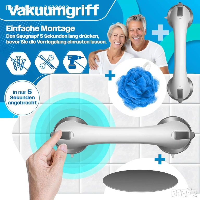 Сглобяването на душ стола е изключително лесно и не изисква инструменти. Крилчатите гайки могат лесно да се затегнат на ръка, а включената вакуумна дръжка може да се закрепи здраво за секунди.