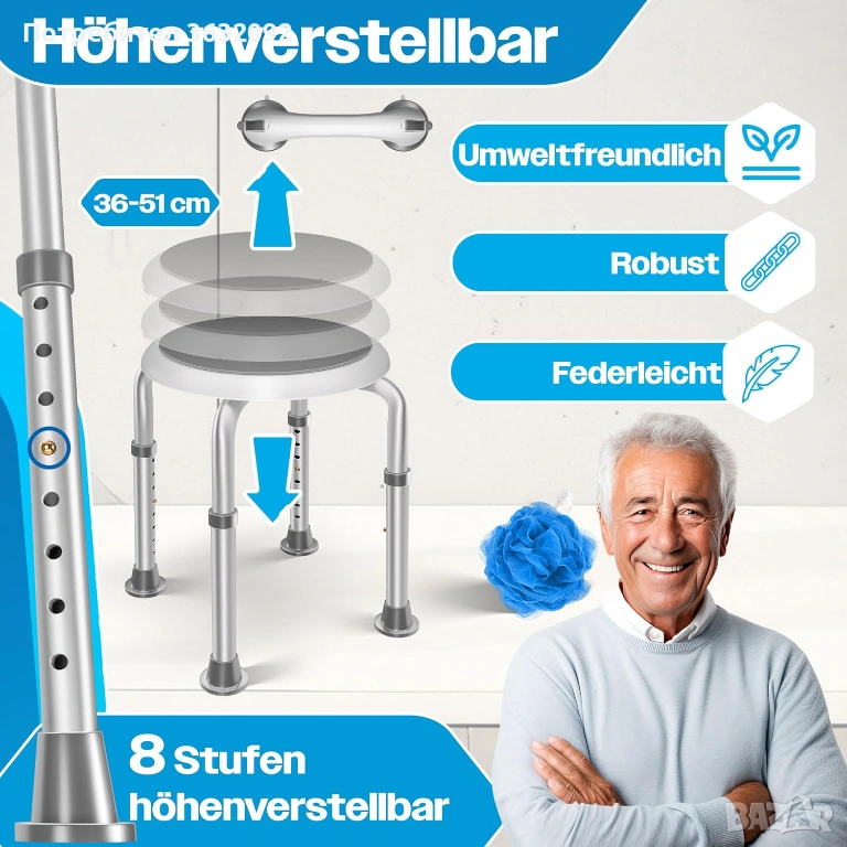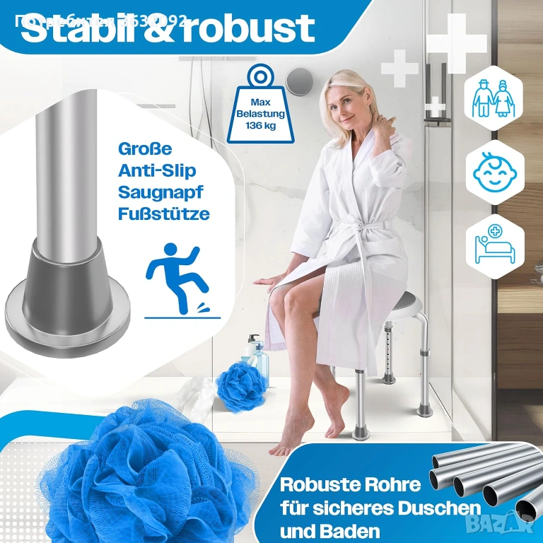 Душ столът е регулируем на височина в 8 стъпки, от 39 см до 57 см, като се адаптира перфектно към различни размери и нужди на тялото. Въпреки лекото си тегло от само 2,8 кг, той е изключително здрав и може да издържи максимално натоварване до 150 кг, което осигурява стабилна и сигурна седалка под душа, дори за по-тежки хора.
