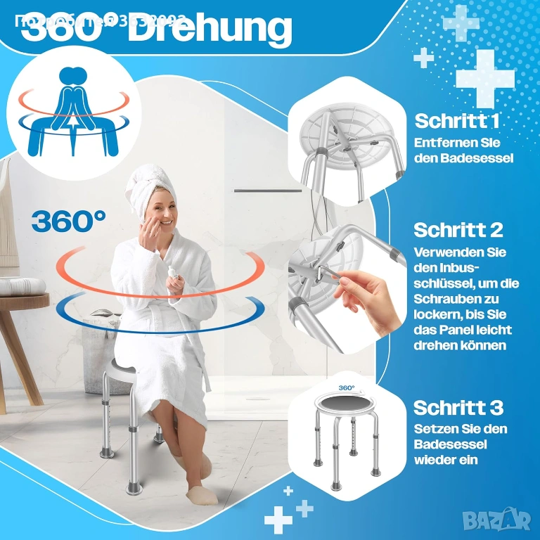 Регулируем на височина стол за баня/душ с неплъзгащи се крака и въртяща се на 360° основа